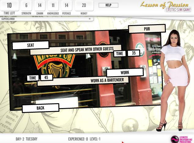 You start things off by spending skill points (we suggest maxing out your Charm) and going through various day-to-day activities. Basically, your main task is to become skilled enough to please Aria. Just in case you’re feeling lost, there’s a HELP button.
